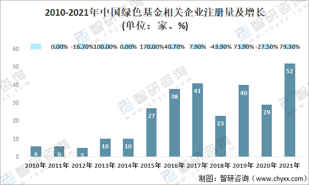 近年来,绿色基金在我国得到了较大发展。2021年中国绿色基金相关企业注册量从2010年的6家增长至52家,是将近是2010年的5倍。
