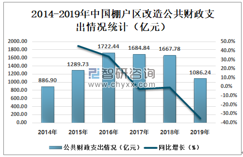 智研咨询发布的《2020-2026年中国棚户区改造行业市场行情监测及投资战略规划报告》数据显示:2014-2019年中国棚户区改造公共财政支出逐年减少,2018年中国棚户区改造公共财政支出1667.78亿元,同比减少1.0%;2019年中国棚户区改造公共财政支出1086.24亿元,同比减少34.9%。