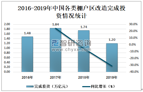 2017-2019年中国各类棚户区改造完成投资逐年减少,2018年中国各类棚户区改造完成投资1.74万亿元,同比减少5.4%;2019年中国各类棚户区改造完成投资1.20万亿元,同比减少31.0%。