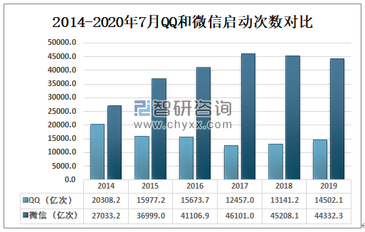 2019年QQ启动次数为14502.1亿次,较2018年增长了1360.9亿次;微信启动次数为44332.3亿次,较2018年减少了875.8亿次。