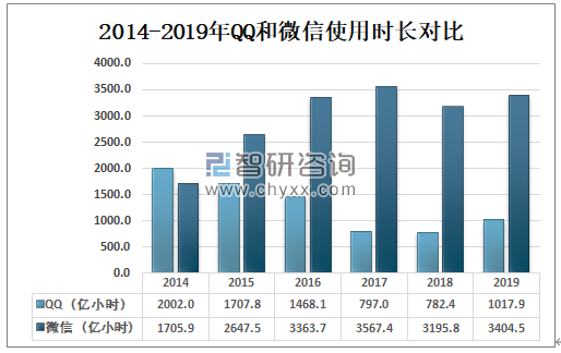 2019年QQ使用时长为1017.9亿小时,较2018年增加了235.5亿小时;微信使用时长为3404.5亿小时,较2018年增加了208.7亿小时。