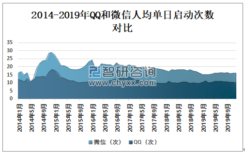 2014-2019年QQ和微信日均启动次数对比