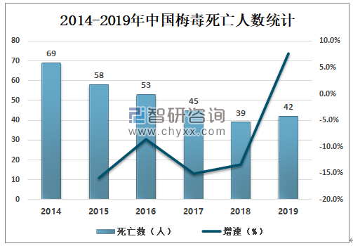 2014-2019年中国梅毒死亡人数逐年减少,2018年中国梅毒死亡人数为39人,较2017年减少了6人,2019年较2018年有所增长,2019年中国梅毒死亡人数为42人,较2017年增加了3人。