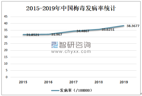 2015-2019年中国梅毒发病率逐年增加,2018年中国梅毒发病率为35.6251/10万,较2017年增加了1.1384/10万;2019年中国梅毒发病率为38.3677/10万,较2018年增加了2.7426/10万。