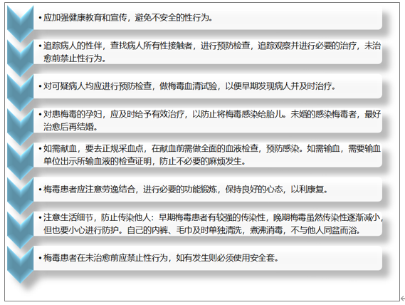 梅毒的预防措施主要有:1、应加强健康教育和宣传,避免不安全的性行为。2、追踪病人的性伴,查找病人所有性接触者,进行预防检查,追踪观察并进行必要的治疗,未治愈前禁止性行为。3、对可疑病人均应进行预防检查,做梅毒血清试验,以便早期发现病人并及时治疗。4、对患梅毒的孕妇,应及时给予有效治疗,以防止将梅毒感染给胎儿。未婚的感染梅毒者,最好治愈后再结婚。5、如需献血,要去正规采血点,在献血前需做全面的血液检查,预防感染。如需输血,需要输血单位出示所输血液的检查证明,防止不必要的麻烦发生。6、梅毒患者应注意劳逸结合,进行必要的功能锻炼,保持良好的心态,以利康复。7、注意生活细节,防止传染他人:早期梅毒患者有较强的传染性,晚期梅毒虽然传染性逐渐减小,但也要小心进行防护。自己的内裤、毛巾及时单独清洗,煮沸消毒,不与他人同盆而浴。发生硬下疳或外阴、肛周扁平湿疣时,可以使用清热解毒、除湿杀虫的中草药煎水熏洗坐浴。8、梅毒患者在未治愈前应禁止性行为,如有发生则必须使用安全套。