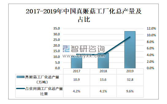智研咨询发布的《2020-2026年中国真姬菇种植产业发展动态及投资前景预测报告》数据显示:2017-2019年真姬菇工厂化总产量逐年增加,2018年中国真姬菇工厂化总产量为13.6万吨,占食用菌工厂化总产量的4.1%。2019年中国真姬菇工厂化总产量为32.8万吨,较2018年同比增长58.63%,占食用菌工厂化总产量的9.6%。