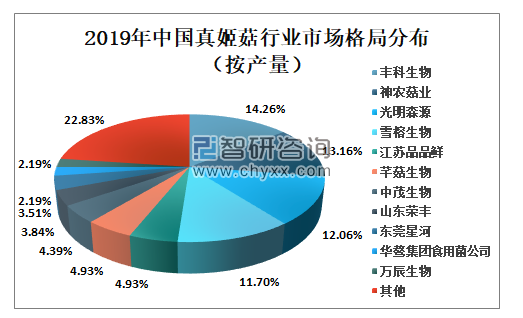 从产量来看,丰科生物、神农菇业、光明森源及雪榕生物市场占比较大,2019年丰科生物真姬菇产品市场份额达14.26%;其次为神农菇业,市场占比为13.16%;光明森源及雪榕生物市场占比分别为12.06%、11.70%。