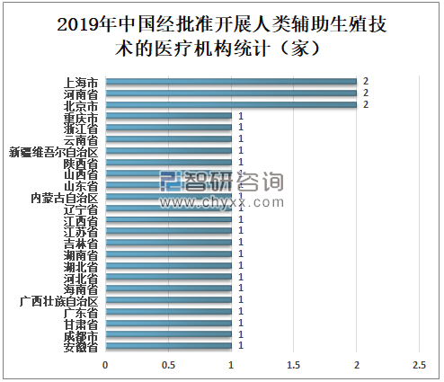 2019年中国经批准开展人类辅助生殖技术的医疗机构共517家,其中广东省56家、江苏省33家、河北省31家、山东省31家、河南省30家、湖北省28家、浙江省27家、湖南省23家、广西壮族自治区21家、上海市19家、北京市18家、辽宁省18家、江西省18家、云南省17家、福建省15家、安徽省14家、四川省13家、贵州省13家、山西省12家、天津市11家、黑龙江省10家、吉林省9家、重庆市9家、陕西省9家、内蒙古自治区8家、海南省8家、新疆维吾尔自治区7家、甘肃省4家、青海省2家、宁夏回族自治区2家、西藏自治区1家。