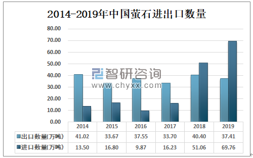 智研咨询发布的《2020-2026年中国萤石产业前景规划及投资战略分析报告》数据显示:2018年中国萤石进口数量首次超过出口数量,2018年中国萤石出口数量为40.40万吨,进口数量达51.06万吨;2019年中国萤石出口数量为37.41万吨,进口数量为69.76万吨。