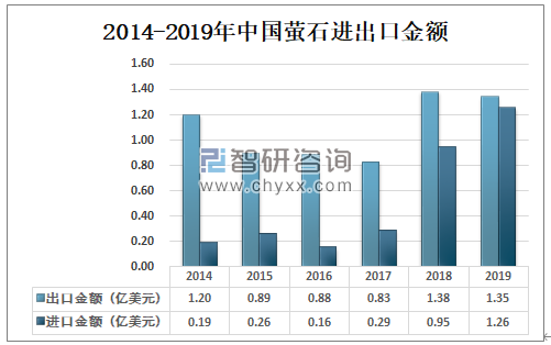 2018年中国萤石出口金额为1.38亿美元,进口金额为0.95亿美元;2019年中国萤石出口金额为1.35亿美元,较2018年减少了0.03亿美元,进口金额为1.26亿美元,较2018年增加0.31亿美元。