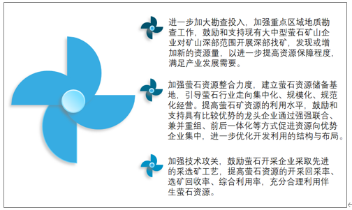 为解决中国萤石行业所存在的问题,政府应加强技术攻关,鼓励萤石开采企业采取先进的采选矿工艺,提高萤石资源的开采回采率、选矿回收率、综合利用率,充分合理利用伴生萤石资源。加强萤石资源整合力度,建立萤石资源储备基地,引导萤石行业走向集中化、规模化、规范化经营。进一步加大勘查投入,加强重点区域地质勘查工作,鼓励和支持现有大中型萤石矿山企业对矿山深部范围开展深部找矿,发现或增加新的资源量,以进一步提高资源保障程度,满足产业发展需要。