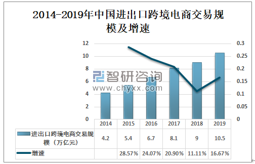 2014-2019年中国进出口跨境电商交易规模及增速
