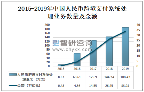 2015-2019年中国人民币跨境支付系统处理业务数量及金额