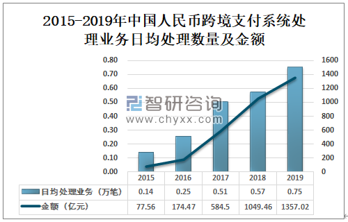智研咨询发布的《2020-2026年中国跨境支付行业市场运营模式及发展前景展望报告》数据显示:2018年人民币跨境支付系统日均处理数量为0.57万笔,日均交易金额为1049.46亿元;2019年人民币跨境支付系统日均处理数量达到0.75万笔,较2018年增加0.18万笔,日均交易金额为1357.02亿元,较2018年增加307.56亿元。