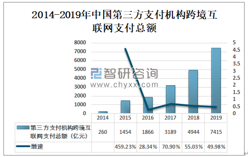 根据中国支付清算协会数据显示,2018年中国第三方支付机构跨境互联网支付总额为4944亿元,较上年同比增长55.03%;2019年中国第三方支付机构跨境互联网支付总额约为7415亿元,较2018年增加了2471亿元。