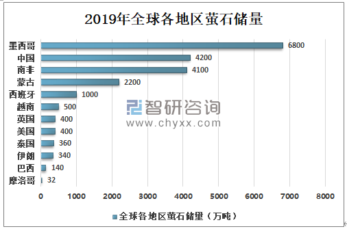 世界萤石矿产资源分布广泛,世界各大洲40多个国家均有发现。其中墨西哥、中国及南非为萤石储量较多的地区,2019年墨西哥萤石储量6800万吨,中国萤石储量4200万吨,南非萤石储量4100万吨。