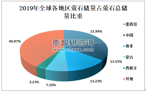智研咨询发布的《2020-2026年中国萤石行业市场供需形势及未来前景分析报告》数据显示:2019年墨西哥萤石储量占全球萤石总储量的21.94%;中国萤石储量占全球萤石总储量的13.55%;南非萤石储量占全球萤石总储量的13.23%。