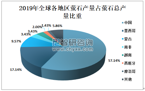 2019年中国萤石产量占全球萤石总产量的57.14%;墨西哥萤石产量占全球萤石总产量的17.14%;蒙古萤石产量占全球萤石总产量的9.57%。