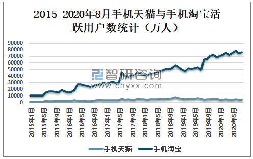智研咨询发布的《2020-2026年中国网购产业运营现状及发展前景分析报告》数据显示:2015年1月至2018年11月手机天猫活跃用户数呈上升趋势,2018年12月后呈下滑趋势。2020年8月手机天猫活跃用户数为4656.66万人,较2020年1月减少了64.94万人。2015-2020年8月手机淘宝活跃用户数总体呈上升趋势,2020年8月手机淘宝活跃用户数为76149.7万人,较2020年1月增加了5521.7万人。