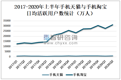 2020年二季度手机天猫日均活跃用户数为994万人,较2020年一季度增加了140.5万人;手机淘宝日均活跃用户数为31219.3万人,较2020年一季度增加了3651.8万人。