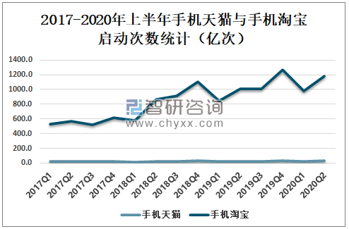 2017-2020年上半年手机天猫启动次数在24.1亿次到35.6亿次之间波动,2020二季度手机天猫启动次数为30.8亿次,较2020年一季度增加了7.5721。2017-2020年上半年手机淘宝启动次数总体呈上升趋势,2020二季度上半年手机淘宝启动次数为1180.1亿次,较2020年一季度增加了196.6530亿次。