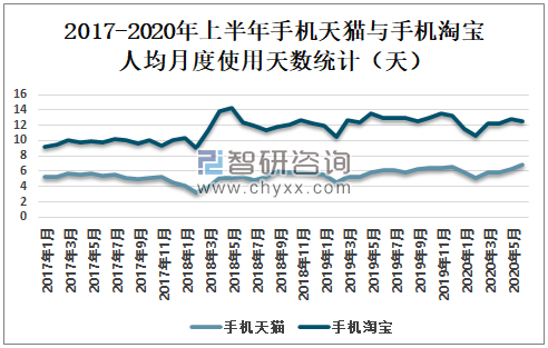 2020年6月手机天猫人均月度使用天数为6.9天,较2020年1月增加了1.1天;手机淘宝人均月度使用天数为12.6天,较2020年1月增加了1.1天。