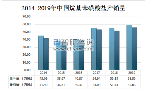 烷基苯磺酸盐作为传统的表面活性剂依然保持着主要的市场份额,根据中国洗协表面活性剂专业委员会数据统计:2019年中国烷基苯磺酸盐产量为58.83万吨,较2018年增加3.7万吨;2019年烷基苯磺酸盐销量为55.83万吨,较2018年增加4.1万吨。