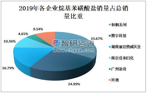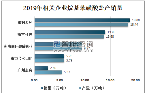 中国主要生产烷基苯磺酸盐企业有赞宇科技、湖南丽臣奥威实业、南京佳和日化及广州浪奇等;2019年和桐系列、赞宇科技、湖南丽臣奥威实业、南京佳和日化及广州浪奇烷基苯磺酸盐产量分别为18.44万吨、13.68万吨、9.27万吨、5.79万吨、5.37万吨;销量分别为18.80万吨、13.95万吨、9.37万吨、5.78万吨、2.60万吨。