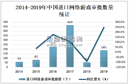 2018年中国进口网络游戏审批数量为53个,较2017年减少了411个;2019年中国进口网络游戏审批数量为185个,较2018年增加了132。