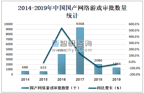 近年来网络游戏审批监管趋严,2017-2019年中国国产网络游戏审批数量逐年减少,2018年中国国产网络游戏审批数量为2086个,较2017年减少了7282个;2019年中国国产网络游戏审批数量为1384个,较2018年减少了702个。