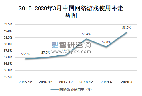 2015-2018年年底中国网络游戏使用率持续上升,2019上半年中国网络游戏使用率为57.8%,较2018年年底下降了0.6%;2020年3月中国网络游戏使用率为58.9%,较2019年上半年增长了1.1%。