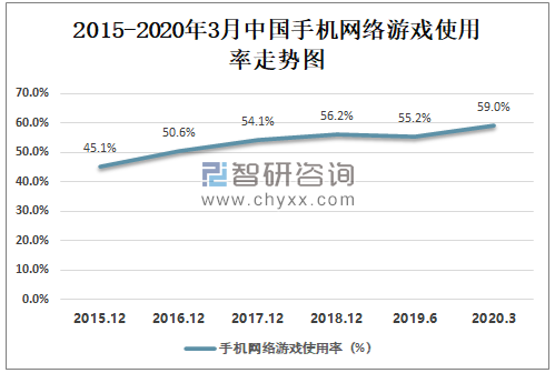 2015-2018中国手机网络游戏使用率持续增长,2019年上半年中国手机网络游戏使用率为55.2%,较2018年年底减少了1.0%,2020年受新冠肺炎疫情影响,中国手机网络游戏使用率迅速增长,2020年3月中国手机网络游戏使用率为59.0%,较2019年上半年增加了3.8%。