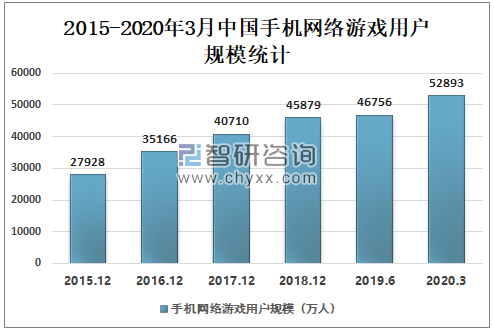2015-2020年3月中国手机网络游戏用户规模持续增长,2019上半年中国手机网络游戏用户规模为46756万人,较2018年年底增加了877万人,2020年受新冠肺炎疫情影响,中国手机网络游戏用户规模快速增加,2020年3月中国手机网络游戏用户规模为52893万人,较2019上半年增加了6137万人。