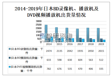 2019年日本BD录像机出货量2015千件;日本BD播放机出货量512千件;日本DVD视频播放机出货量335千件,都呈下降趋势。