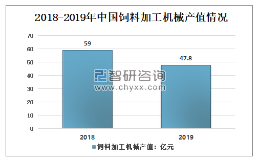 2018年中国饲料加工机械产值59亿元;2019年中国饲料加工机械产值47.8亿元,比上年减少11.2亿元。