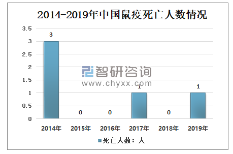 2014年中国因感染鼠疫死亡人数3人,2015、2016、2018年没有人因感染鼠疫死亡,2017、2019年因鼠疫死亡各1人。