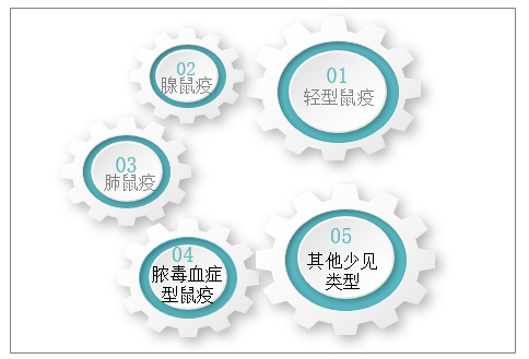 根据临床表现和发病特点,可将鼠疫分为轻型鼠疫、腺鼠疫、肺鼠疫、脓毒血症型鼠疫和其他类型鼠疫。不同的分型,潜伏期有不同,腺鼠疫2~8天,肺鼠疫数小时至2~3天,曾预防接种者可延至9~12天。