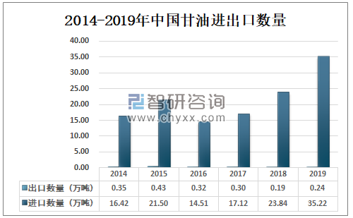 多年来中国甘油一直供不应求,早在1972年就开始从日本进口甘油,到2019年,中国甘油进口数量达到35.22万吨,较2018年增加11.38万吨;2019年甘油出口数量仅为0.24万吨,较2018年增加0.05万吨。