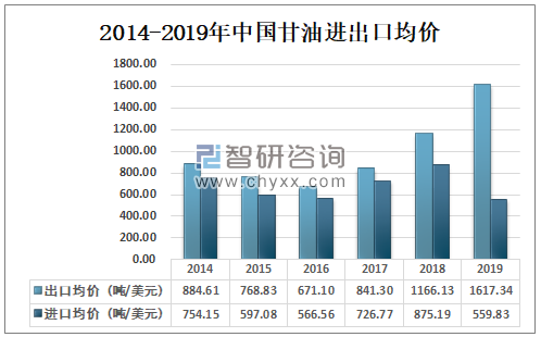 中国甘油出口均价大于进口均价,且2016-2019年出口均价逐年增加,2019年中国甘油出口均价达到1617.34吨/美元;2019年中国甘油进口均价为559.83吨/美元,较2018年下降315.36吨/美元。