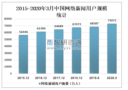 2015-2020年3月中国网络新闻用户规模持续增长,2019上半年中国网络新闻用户规模为68587万人,较2018年年底增加了1114万人,2020年受新冠肺炎疫情的影响,中国网络新闻用户规模迅速增长,2020年3月中国网络新闻用户规模为73072万人,较2019上半年增加了4485万人。