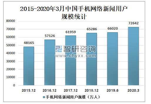 2015-2020年3月中国手机网络新闻用户规模持续增长,2019年上半年中国手机网络新闻用户规模为66020万人,较2018年年底增加了734万人,2020年受新冠肺炎疫情的影响,中国手机网络新闻用户规模迅速增长,2020年3月中国手机网络新闻用户规模为72642万人,较2019年上半年增加了6622万人。