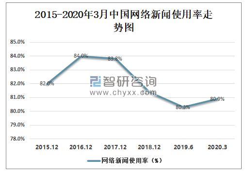 智研咨询发布的《2020-2026年中国网络新闻行业运营模式分析及市场发展前景报告》数据显示:2016-2019年上半年中国网络新闻使用率逐步下滑,2019年上半年中国网络新闻使用率为80.3%,较2018年年底减少了1.1%,2020年受新冠肺炎疫情的影响,中国网络新闻使用率有所回升,2020年3月中国网络新闻使用率为80.9%,较2019年上半年增长了0.6%。
