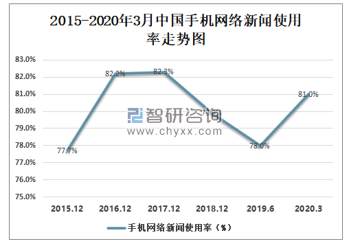 2017-2019年上半年中国手机网络新闻使用率逐步下滑,2019年上半年中国手机网络新闻使用率为78.0%,较2018年年底减少了1.9%,2020年受新冠肺炎疫情的影响,中国手机网络新闻使用率有所回升,2020年3月中国手机网络新闻使用率为81.0%,较2019年上半年增长了3.0%。