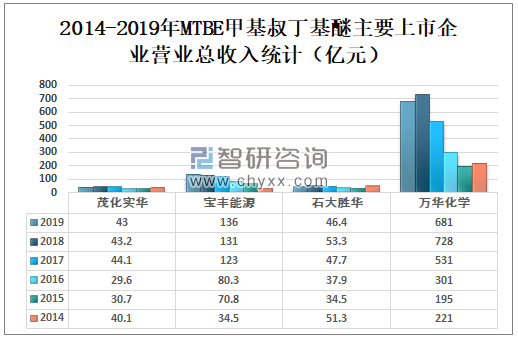 2014-2019年MTBE甲基叔丁基醚主要上市企业营业总收入统计(亿元)