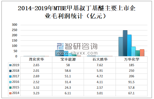 2014-2019年MTBE甲基叔丁基醚主要上市企业毛利润统计(亿元)