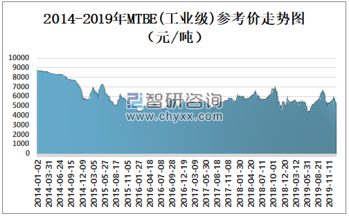智研咨询发布的《2020-2026年中国甲基叔丁基醚产业前景规划及投资战略分析报告》数据显示:从2014-2019年MTBE(工业级)参考价走势图可以看出,2014年1月开始MTBE(工业级)参考价开始下滑,2015年2月后MTBE(工业级)参考价总体来看呈上升趋势,大部分时间以震荡为主。2019年12月31日MTBE(工业级)参考价为5383.33元/吨,较2019年1月1日增长了303.13元/吨。