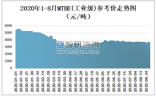 2020年年初开始MTBE(工业级)参考价逐步下滑,5月中旬开始回升,6月下旬又开始缓慢下滑。2020年8月31日MTBE(工业级)参考价为3683.33元/吨,较2020年1月1日减少了1700元/吨。