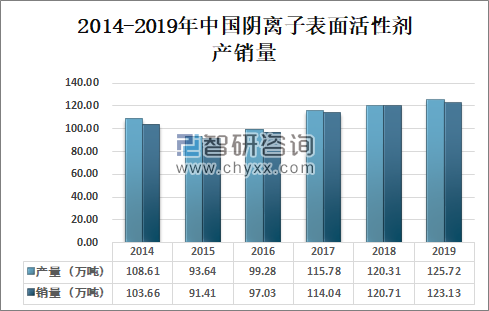 根据中国洗协表面活性剂专业委员会不完全数据统计,2019年中国阴离子表面活性剂产量为125.72万吨,较2018年同比增长4.5%;2019年中国阴离子表面活性剂销量为123.13万吨,较2018年同比增长2%。