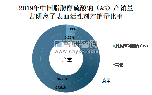 2019年中国脂肪醇硫酸钠(AS)产销量占阴离子表面活性剂产销量比重