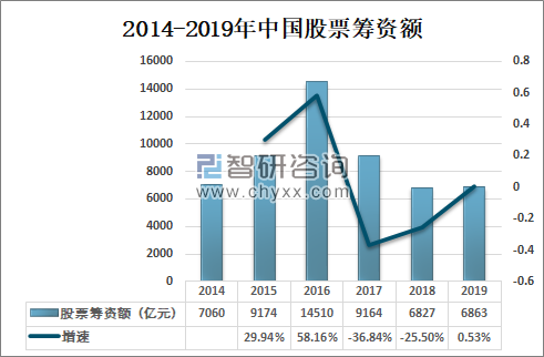 2016-2018年中国股票筹资额逐年下降,2017年中国股票筹资额为2014-2019年峰值,筹资额为14510亿元,2019年中国股票筹资额稍有回升,2019年股票筹资额为6863亿元,较2018年同比增长0.53%。
